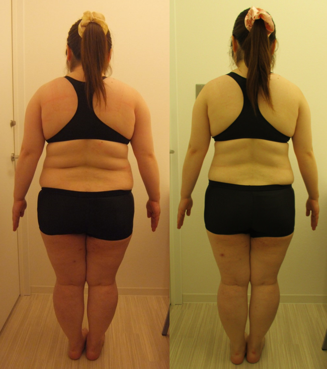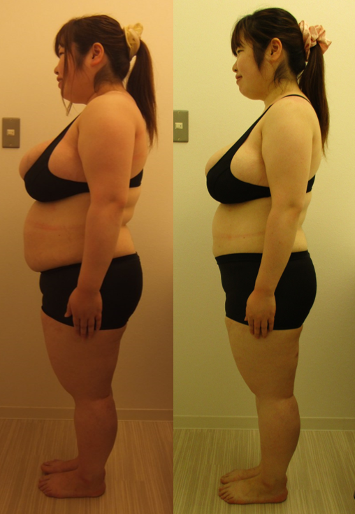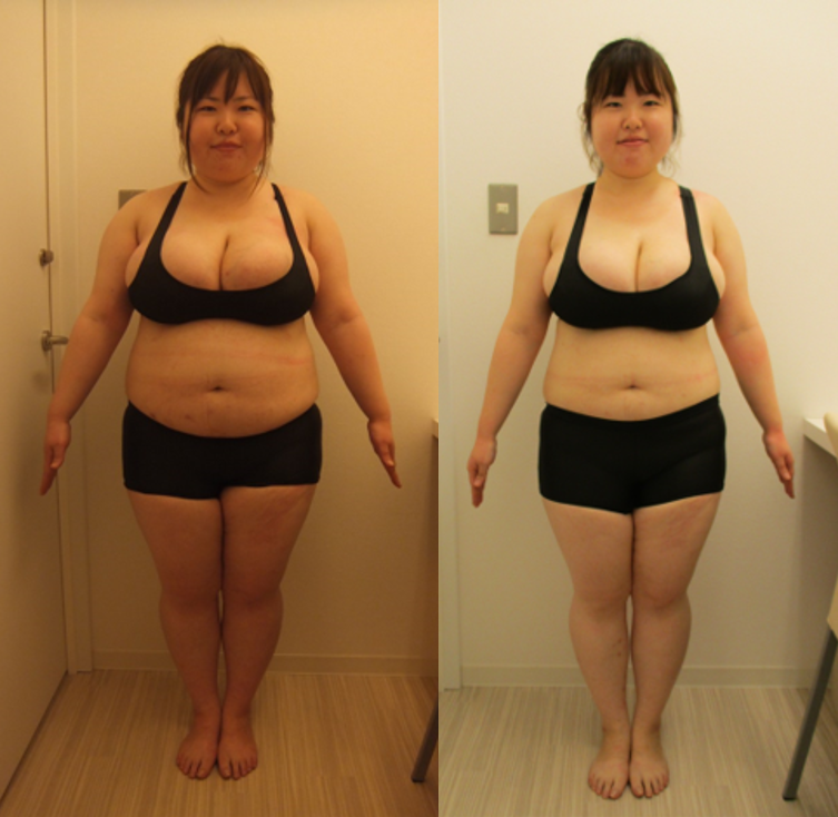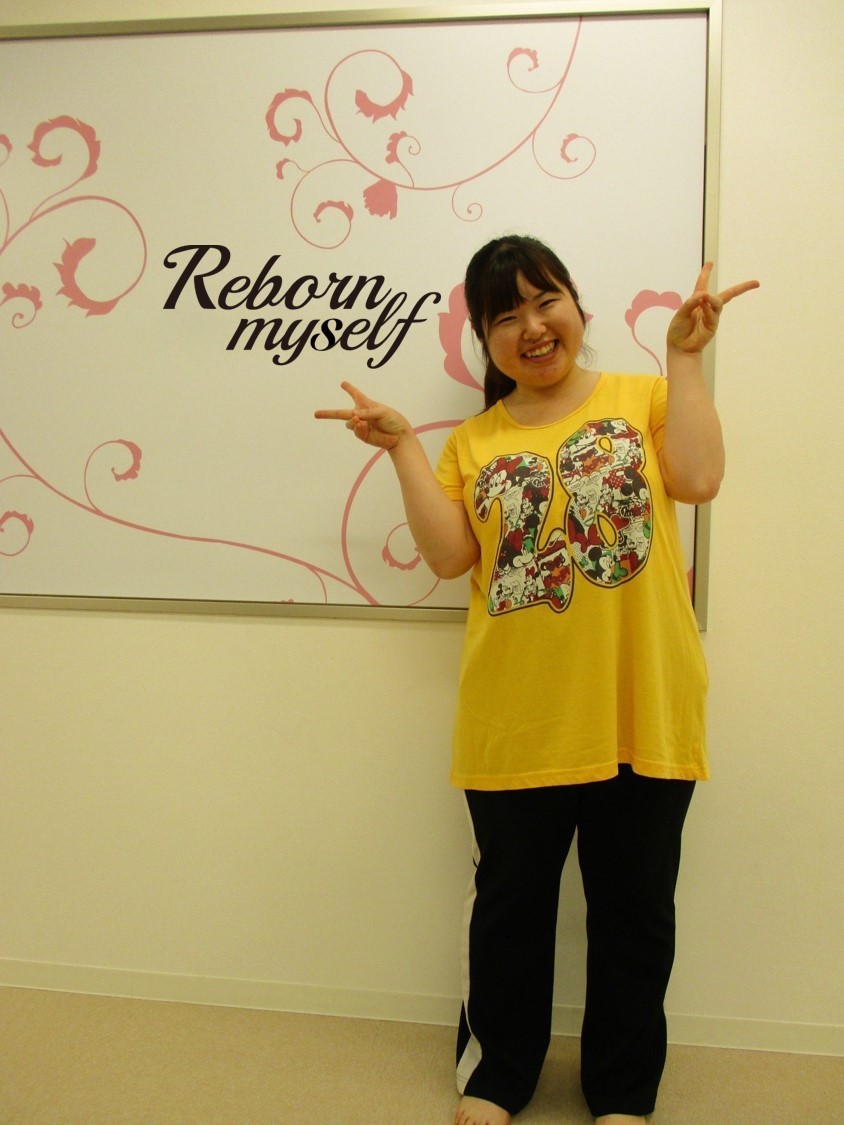 みなさまこんにちは! リボーンマイセルフ宇都宮店の小黒です。 だいぶ気候も涼しくなり、過ごしやすくなってきました。 秋になるとスポーツの秋、食欲の秋になりますね! まだダイエットをしようか迷っている方! これからの時期にダイエットを始めてみてはいかがでしょうか? さて、本日は宇都宮店でモニターコースを終えられた お客さまの結果報告をさせていただきたいと思います。 高橋めぐみさま(26歳)です☆ さて、今回高橋さまはどんな結果がでたのでしょうか? 高橋めぐみさま(26歳) 152cm 開始日 2015.06.11 終了日 2015.08.17 ウエスト 95.0cm → 85.0cm -10.0cm おへそ 99.0cm → 95.6cm -3.4cm ヒップ 115.7cm → 106.7cm -8.3cm 太もも 67.5cm → 62.0cm -5.5cm 体重 89.0kg → 76.0kg -13.0kg 体脂肪率 44.8% → 42.5% -2.3% まずは正面のお写真からご覧ください。 (2015.06.11) (2015.08.17)全体的にスッキリとされましたね♪ 特に変化が分かりやすいのは肩幅とお腹周り! 肩幅が一回り小さくなり、お腹周りがすっきりされたことで、 全体的な体のバランスがとてもよくなり、女性らしいボディラインになりました。 続いては横のお写真です。 (2015.06.11) (2015.08.17)