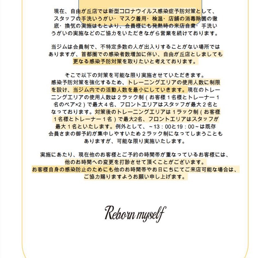 トレーニングエリアは通常2ラック制のところを可能な限り1ラック制に、またフロントエリアのスタッフ人数も最小限にし、接触人数が少ないようにしております。