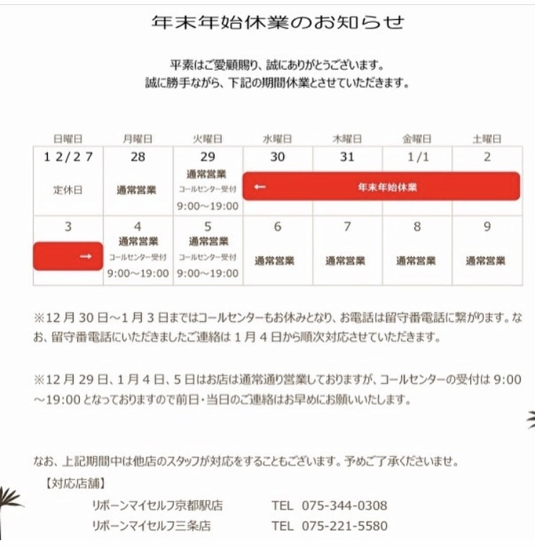 ◆12 月 29 日、1 月 4 日、5 日はお店は通常通り営業しておりますが、コールセンターの受付は 9:00 〜19:00 となっておりますので前日・当日のご連絡はお早めにお願いいたします。