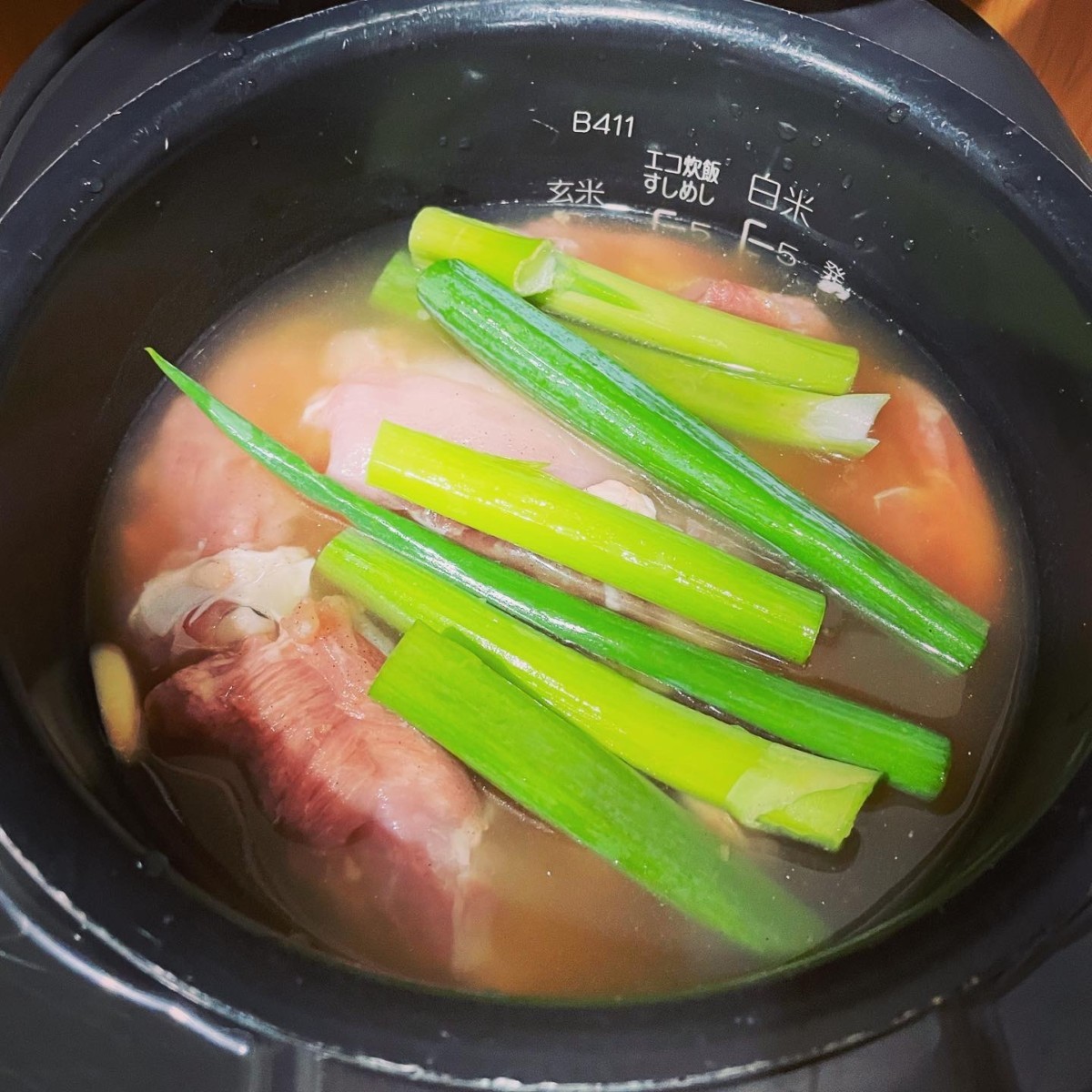 ①お米をたく水は通常通りに入れて、炊き込みの調味料を全て炊飯器に入れる