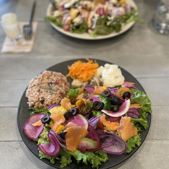 色とりどりの野菜が視界に飛び込んでくる「emino Salad」は、ランチタイムの看板メニューです。野菜を美味しく食べるためのベース、メイン、トッピング、ドレッシングを自分好みにカスタマイズ。一皿で約250gの野菜を摂取することが出来ます🥗✨