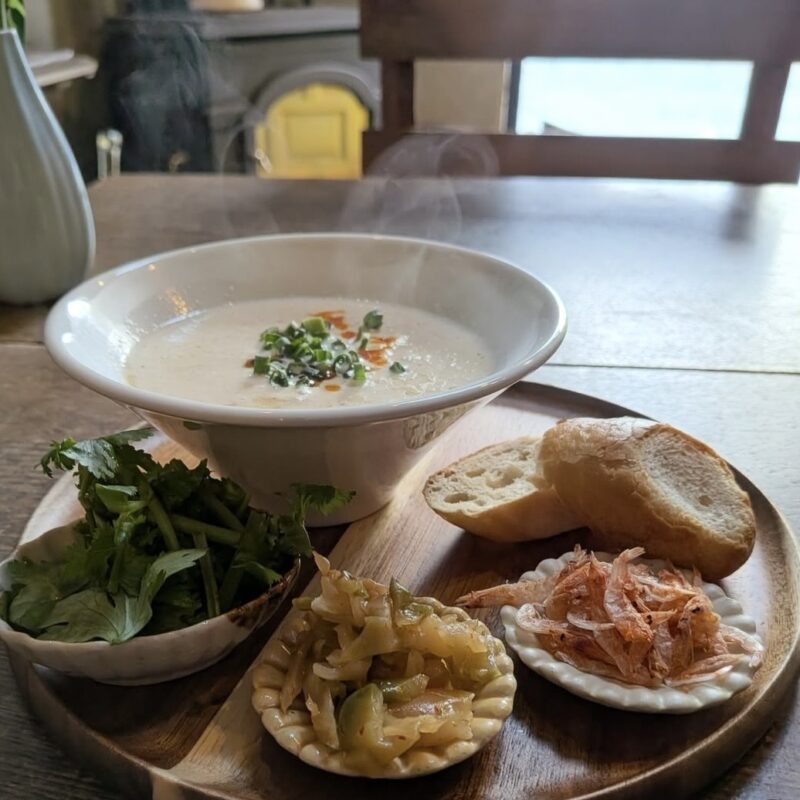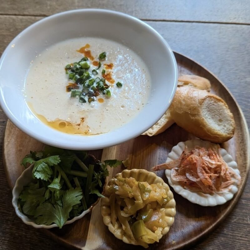 台湾の朝ごはんの定番「シェントウジャン」がお召し上がり頂けます。黒酢ベースにした調味料を合わせ、おぼろ豆腐のようにゆるく固めた豆乳スープ。