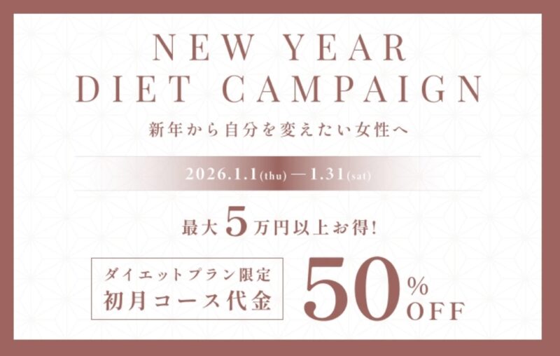 内容:ダイエットプラン限定、初月コース代金50%OFF(最大5万円以上お得)