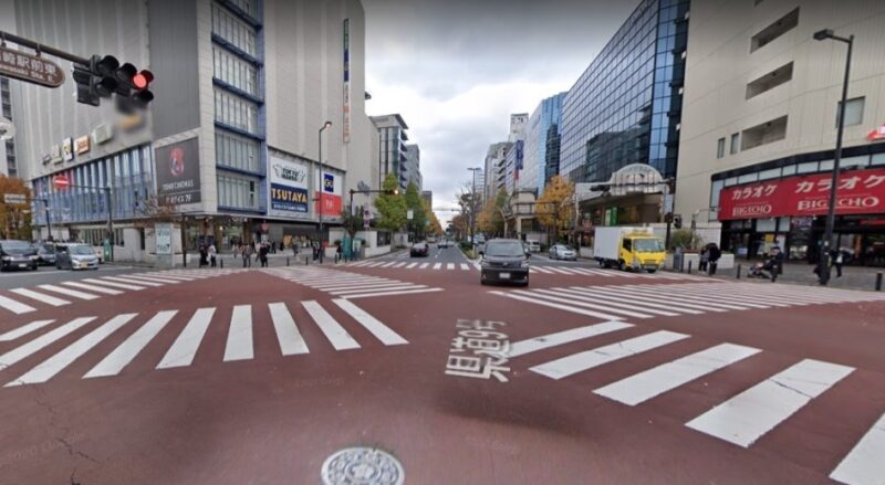 ③スクランブル交差点をTSUTAYA側に渡り、更に直進します。