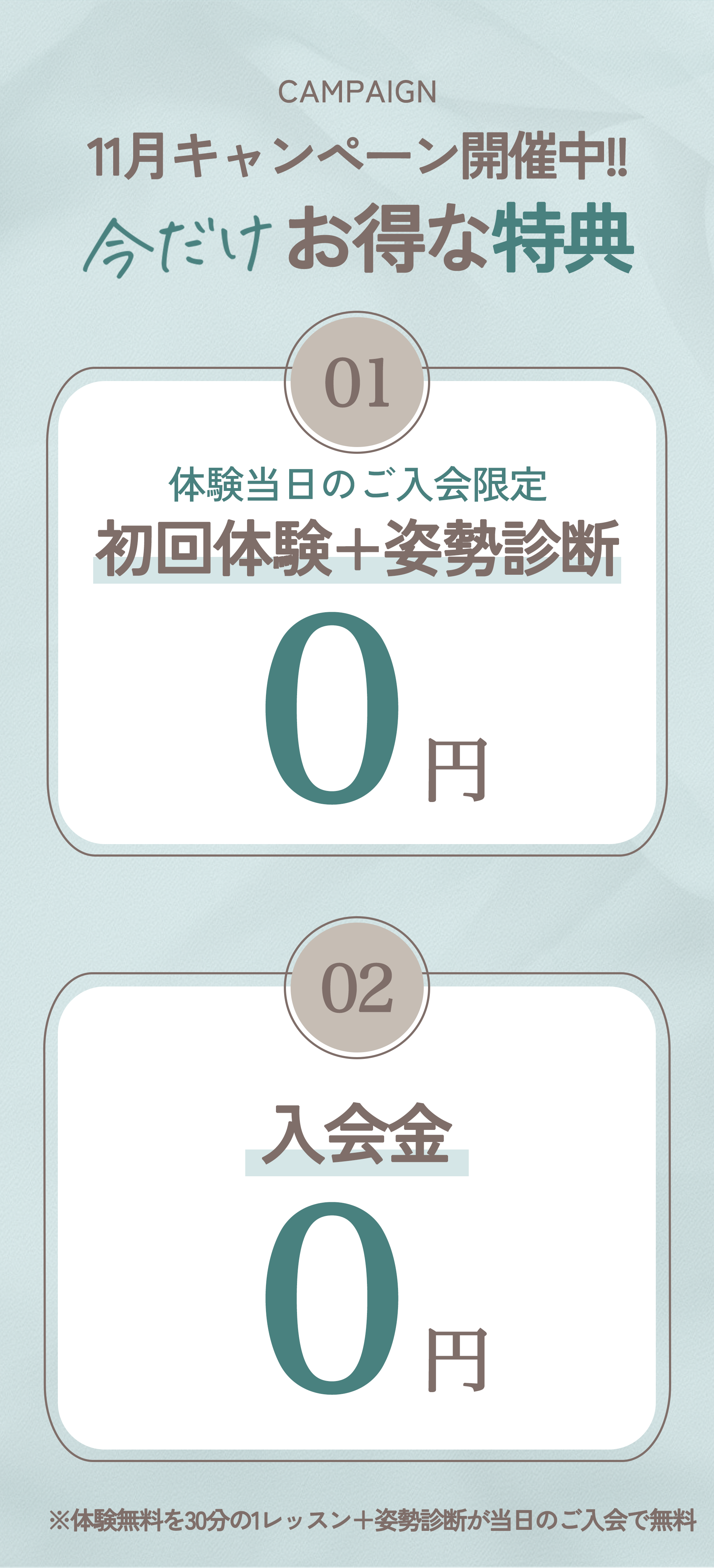 人によってそれぞれ悩みや目的に特化して行い細かい動きをスタッフがしっかり丁寧に確認しながら行うので、姿勢の改善や骨盤が正しい位置に戻ることを早く実感できる方が多く、マンツーマンなので、周りの目を気にせず自分のペースで運動することができます。変化を早く実感することにより、初心者の方でも楽しく安全に、続けたいと思っていただけることも大切にしています。