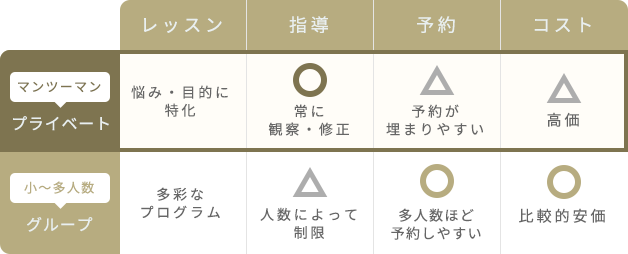 人によってそれぞれ悩みや目的に特化して行い細かい動きをスタッフがしっかり丁寧に確認しながら行うので、姿勢の改善や骨盤が正しい位置に戻ることを早く実感できる方が多く、マンツーマンなので、周りの目を気にせず自分のペースで運動することができます。変化を早く実感することにより、初心者の方でも楽しく安全に、続けたいと思っていただけることも大切にしています。
