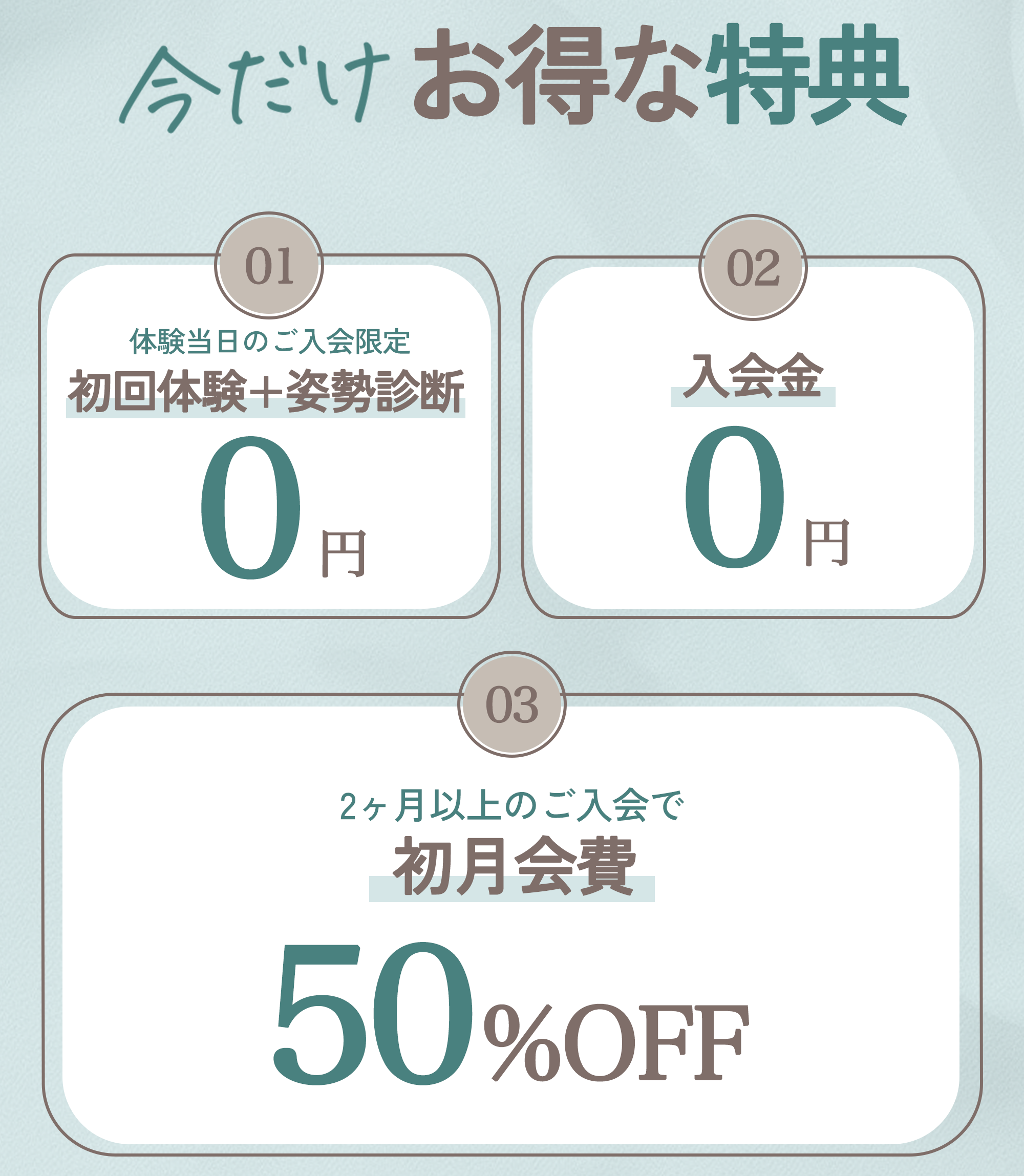 人によってそれぞれ悩みや目的に特化して行い細かい動きをスタッフがしっかり丁寧に確認しながら行うので、姿勢の改善や骨盤が正しい位置に戻ることを早く実感できる方が多く、マンツーマンなので、周りの目を気にせず自分のペースで運動することができます。変化を早く実感することにより、初心者の方でも楽しく安全に、続けたいと思っていただけることも大切にしています。