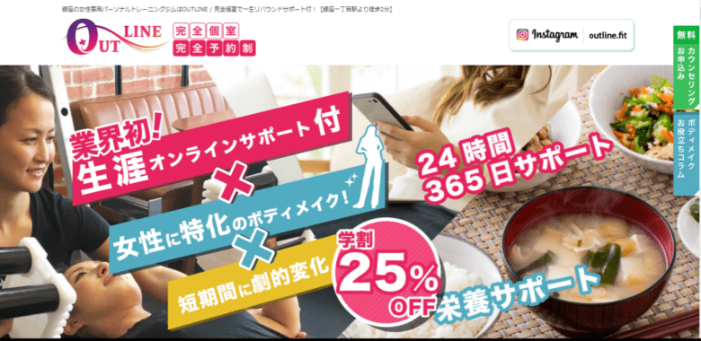OUTLINE(アウトライン)吉祥寺店は、女性専用で完全個室のパーソナルトレーニングジム。女性のダイエットに特化した指導と、高級アミノ酸ドリンクの無料提供で、トレーニング後のリカバリーを支援します。