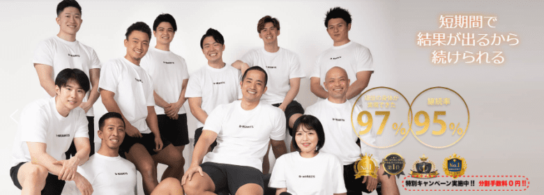 特徴は、無理な食事制限を行わないための高い継続率と、ボディメイクコンテスト入賞経験のあるトレーナーが多数在籍している点です。豊富なプランの中から、それぞれの目的や都合に合ったものを選択できます。