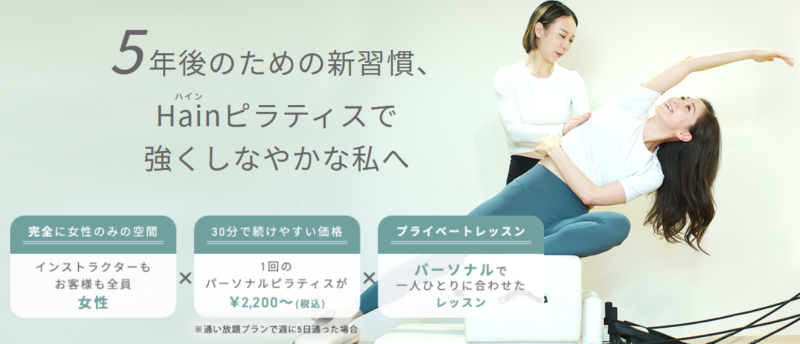 Hain pilatesはリボーンマイセルフの指導メソッドが詰め込まれ、忙しい女性のために30分で完了するパーソナルレッスンのマシンピラティスです。