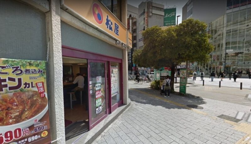 大きな交差点が見えたら、松屋の方に左折し、直進します。