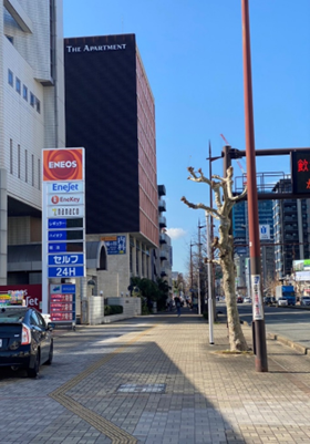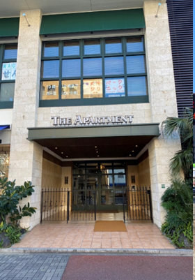 ガソリンスタンドの奥にある『THE APARTMENT』というビルです。