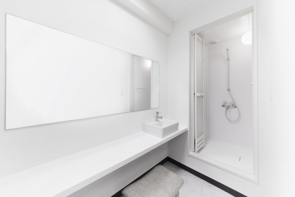 真っ白で清潔感あふれるパウダールーム。個室でお一人お一部屋ご利用いただけますので、周りを気にせずゆっくりとお着替えができます。シャワールームも併設していますので、お仕事前後のご利用、プライベートの予定の合間でもお気軽にご来店いただけます。